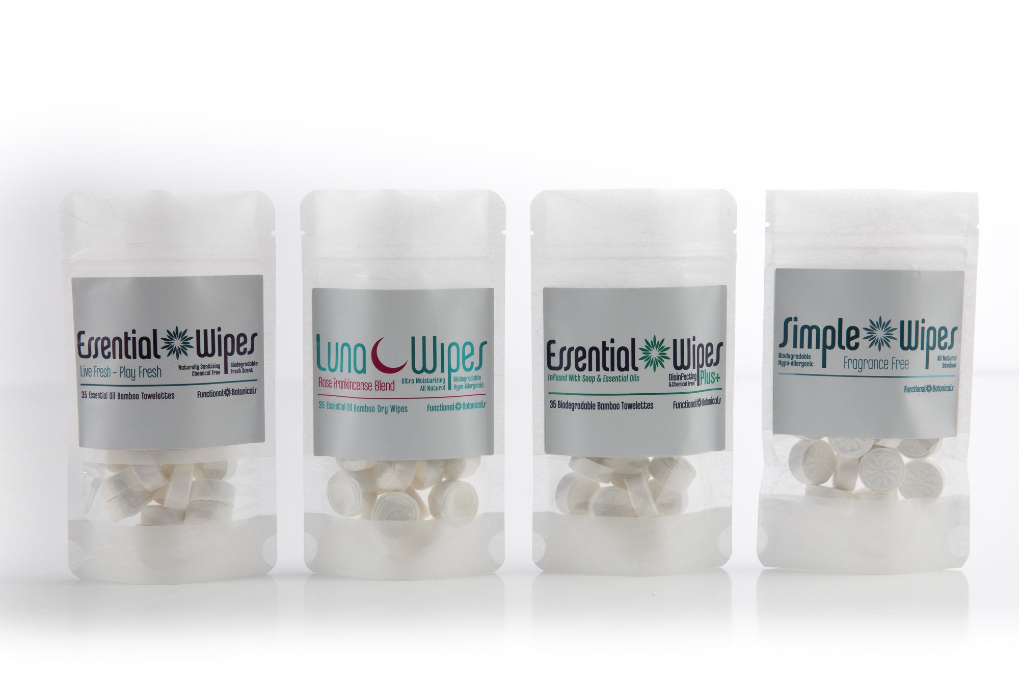 Our Wipes have minimal ingredients - Other wipes have 15 - 30 ingredients, many of which are caustic and can be harmful to the skin. Even the best wipes that feature essential oils and other organics, still contain chemical preservatives. Functional Botanical's Dry Wipes have only pure botanicals, formulated to nourish and cleanse, while not harming the delicate landscape of your skin. Nature knows best.